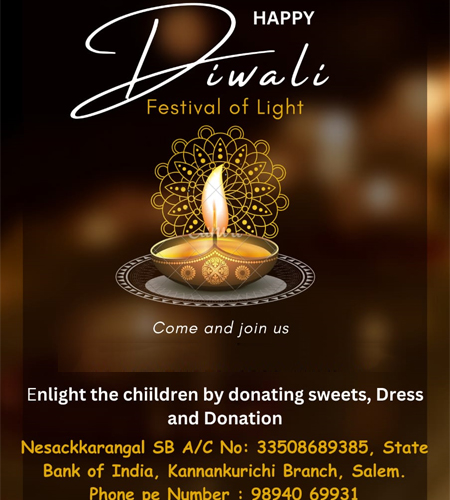 This Diwali, let’s come together to light up not just our homes but also the lives of the children at Nesackkarangal Children Home, Salem.Diwali, the festival of lights, is a time of joy, love, and spreading happiness. It's a time to share our blessings with those in need and make a positive impact in our community.